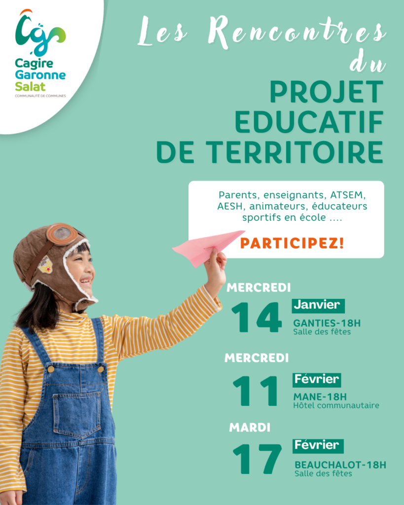 Parce que chacun de nous — parents, enseignants, ATSEM, AESH, animateurs, éducateurs sportifs…, est acteur de l’éducation des enfants de notre territoire, et parce que les enfants ont besoin de cohérence éducative et d’actions complémentaires, la Communauté de communes Cagire Garonne Salat organise trois rencontres dédiées à l’échange.